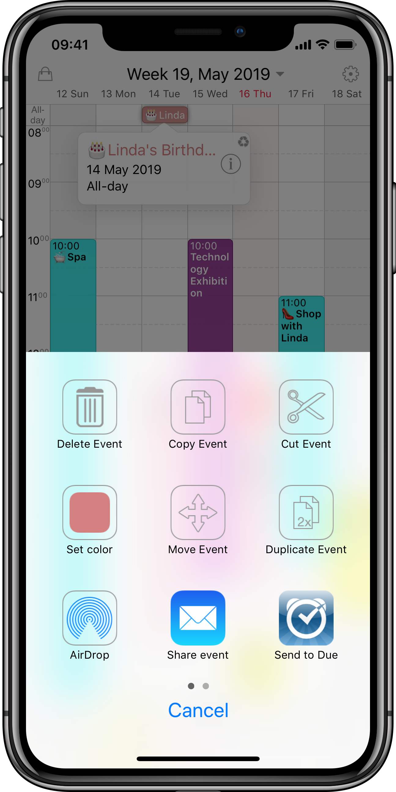 Move your appointments by simply dragging, copying and pasting. Save often used events as a template, create repetitive events, assign colors or emojis to events based on rules, share your events via messaging apps and many other features suited to your personal wishes.